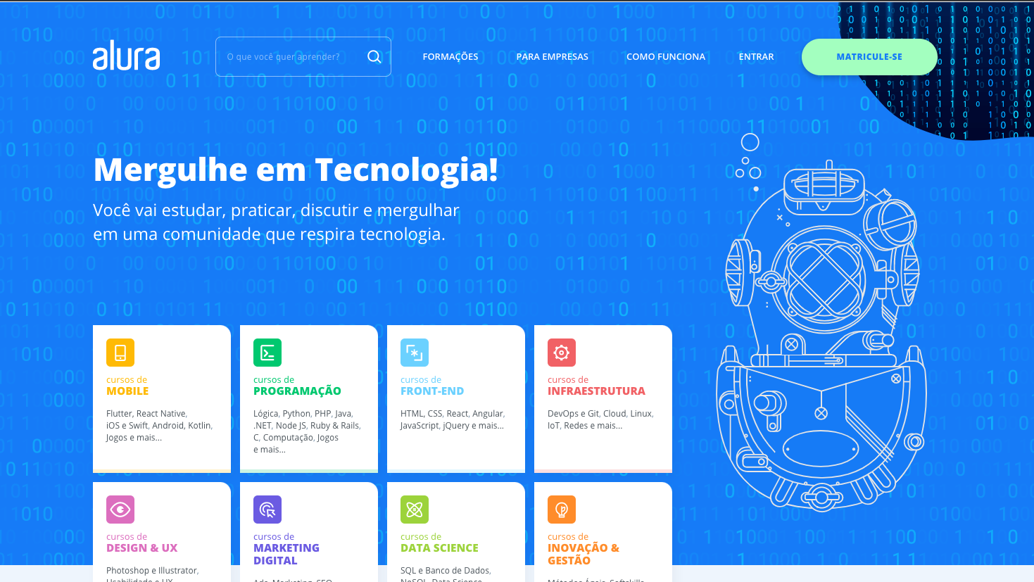 Na Alura, os mais de 1000 cursos podem ajudar você a zarpar e navegar pelas diferentes áreas da Tecnologia e as formações podem auxiliar você a focar, mergulhando em um assunto específico. Dev em <T>. O Scuba Dev!